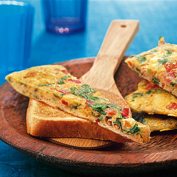 Die Eiermasse in die Pfanne gießen und bei kleiner Hitze stocken lassen. Sobald sich das Omelett wenden lässt, am besten aus der Pfanne auf einen großen, flachen Teller gleiten lassen. Einen zweiten Teller darauflegen, beide Teller mit den Händen fassen und umdrehen. Das gewendete Omelett vorsichtig in die Pfanne zurückgleiten lassen und nur noch kurz von der anderen Seite braten. Herausnehmen, vierteln und mit heißem Toast essen.