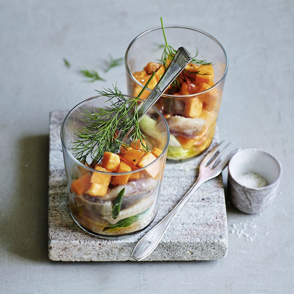 Hier gesellt sich Matjes zu Papaya im Glas und überzeugt mit fruchtig-scharfem Geschmack. Eine besondere Vorspeise für besondere Gäste.