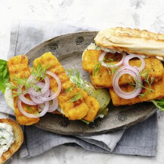 Die Salatblätter waschen und trockenschütteln. Brotscheiben halbieren und jeweils mit einem Salatblatt belegen. Das Matjes-Tatar darauf anrichten und mit den beiseite gelegten Dillspitzen garnieren.