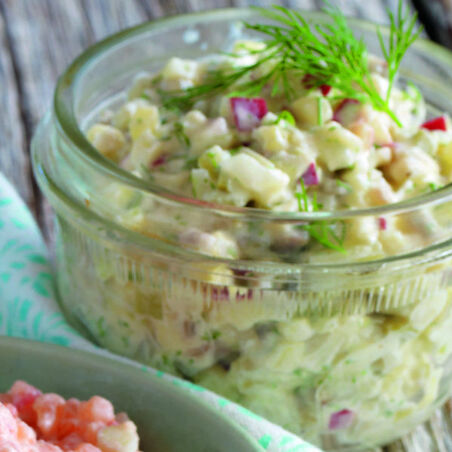 Mayonnaise, saure Sahne und Senf cremig rühren, mit Salz und Pfeffer würzen. Matjes, Schalotten-, Apfel- und Gurkenwürfel sowie Dill unterrühren. Den Aufstrich in eine Schüssel füllen und mit dem übrigen Dill garnieren. Mit dunklem Roggenbrot servieren oder zum Sekt reichen: dazu auf gebutterte Pumpernickeltaler je 1 Scheibe Salatgurke legen und den Aufstrich daraufgeben.