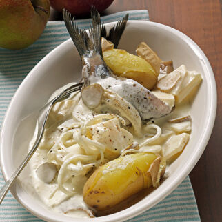 Frischen Matjes erkennt man an der glänzend silbrig-braunen Haut und an der rötlichen Filetunterseite. Hier werden sie ganz traditionell mit feiner Rahmsauce serviert.