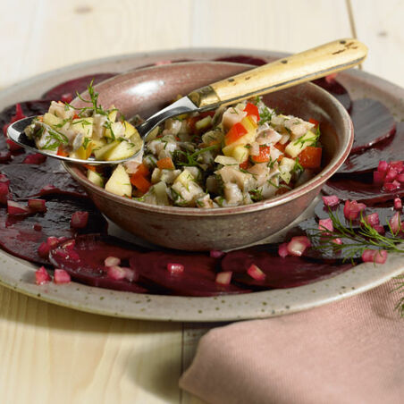 Ein süß-saures Vorspeisenvergnügen: marinierte Rote Bete werden mit einem Tatar von Matjes, Apfel, Paprika und Walnüssen serviert