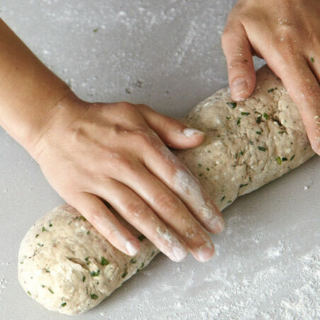 Die Sardinen abtropfen lassen, das Öl dabei auffangen. Die Fische etwas zerzupfen. Die Kräuter waschen, trocken schütteln und die Blättchen hacken. Den Schafskäse mit einer Gabel zerdrücken. Die Füllung in den Teig arbeiten und das Brot zur Schnecke formen.