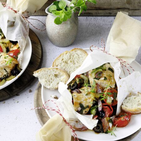 Die vier Päckchen auf ein Blech legen und die Hähnchenbrustfilets im heißen Ofen (Mitte) ca. 18 Min. garen. Anschließend herausnehmen, auf Teller legen und noch ca. 5 Min. ruhen lassen. Dann die Päckchen öffnen und mit Baguette oder Couscous genießen.