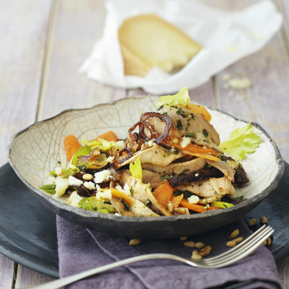 Inzwischen die Pinienkerne in einer zweiten Pfanne ohne Fett hellbraun rösten, dann abkühlen lassen. Das restliche Öl erhitzen und die Zwiebelringe darin knusprig braun braten, dann herausnehmen. Die Bratenstreifen in dieselbe Pfanne geben und kurz braten. Dann die Bratenstreifen mit dem gedünsteten Gemüse und den Pinienkernen in einer Schüssel mischen. Den Salat mit Salz und Pfeffer abschmecken und auf Teller verteilen.