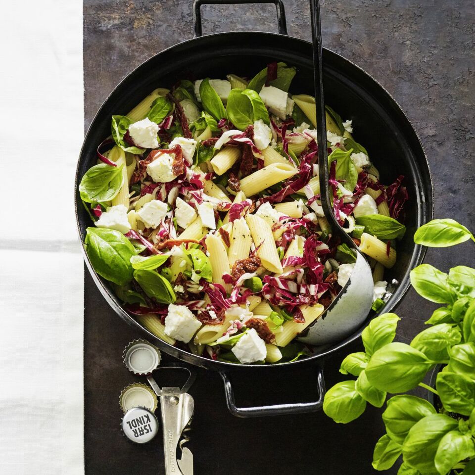 Nudeln, Radicchio, Basilikum, Tomaten und Feta in die Schüssel geben. Mit dem Dressing und den Frühlingszwiebeln vermischen. Den Salat mit Salz und Pfeffer abschmecken.