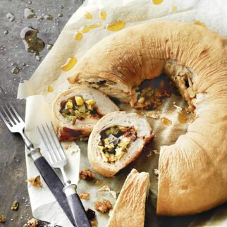 Den Teig von der Längsseite her aufrollen, auf ein mit Backpapier belegtes Backblech legen und zu einem Kranz formen, dabei die Enden zusammendrücken. Den Kranz von außen ca. alle 3 cm zur Mitte ein-, aber nicht durchschneiden und die Abschnitte um 90° drehen, sodass die Füllung oben zu sehen ist. Den Kranz mit dem übrigen Käse bestreuen und im Ofen (unten) 25-30 Min. backen.