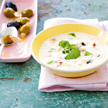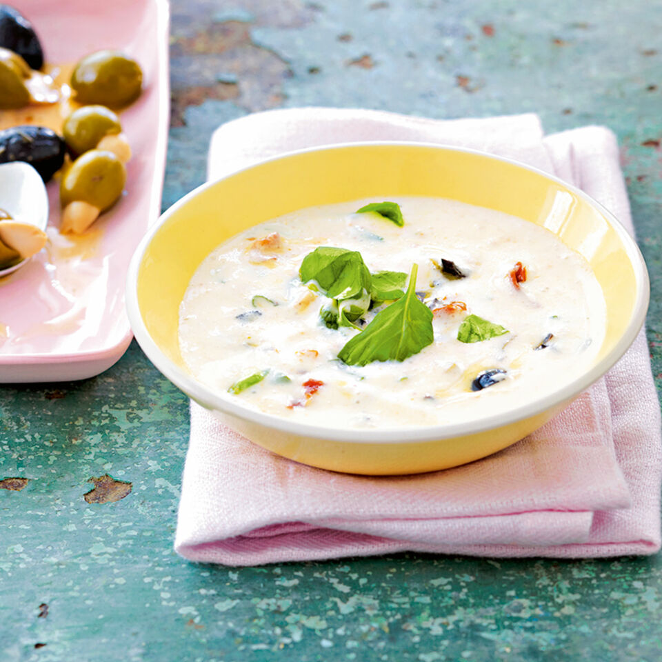 Sojajoghurt unter die Masse rühren und mit Salz, Pfeffer und Chili würzen. Tomaten und Oliven möglichst fein würfeln. Basilikum waschen, trocken schütteln, Blättchen abzupfen und in feine Streifen schneiden. Alles unter die Sojacreme rühren und möglichst noch kurz ziehen lassen.