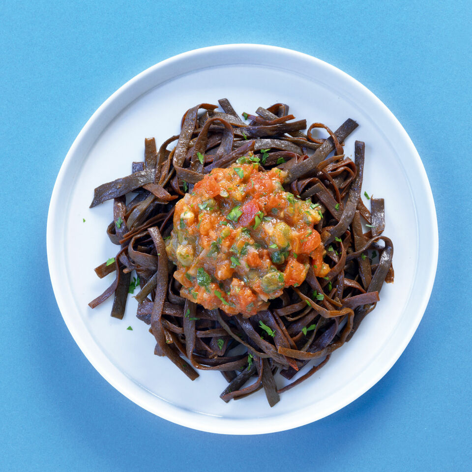 Einkaufstipp: Meeres-Spaghetti sind sehr nährstoffreiche Braunalgen (»Himanthalia elongata«), die von der Form her Spaghetti oder Tagliatelle ähneln. Meistens werden sie getrocknet angeboten. Frische Meeres-Spaghetti zunächst zum Entsalzen 3-4 Min. in kaltem Wasser einweichen und dann abtropfen lassen. Die Algen anschließend in 1-2 Min. al dente garen.