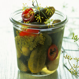 Vom Herd nehmen und die Einmachhilfe einrühren. Die Flüssigkeit noch heiß über die Gurken geben, die Gläser sofort verschließen und 5 Min. auf den Kopf stellen. 1 Woche durchziehen lassen.