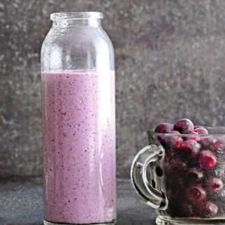 Den Mixer verschließen und auf kleinster Stufe starten. Dann alles auf höchster Stufe 40-50 Sek. fein pürieren, bis ein cremiger Drink entstanden ist.