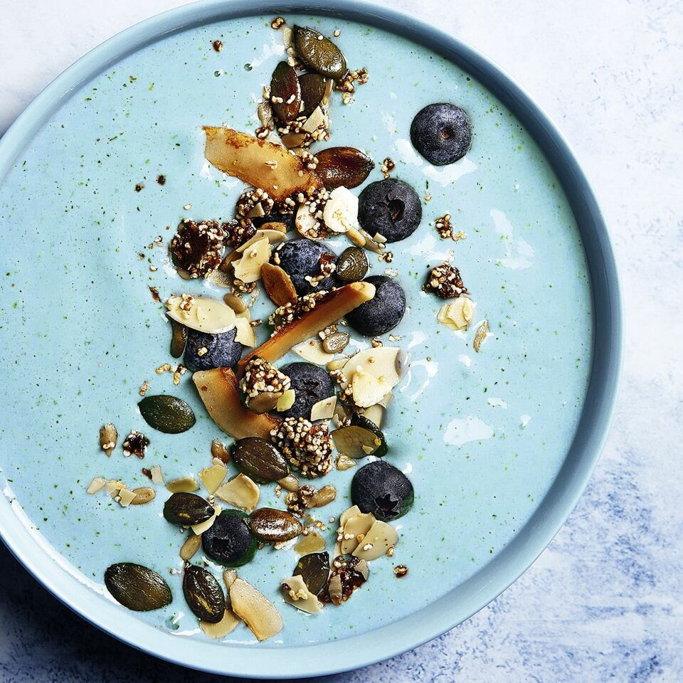 Diese Smoothie-Bowl ist dank der blauen Farbe ein toller Hingucker und kann sowohl zum Frühstück als auch als gesunder Nachtisch gegessen werden. Die Spirulina-Alge (hier in Pulverform) versorgt dich mit Zink - einem wichtigen Nährstoff für das Immunsystem und die Produktion des natürlichen Selbstbewusstseinsboosters Testosteron.