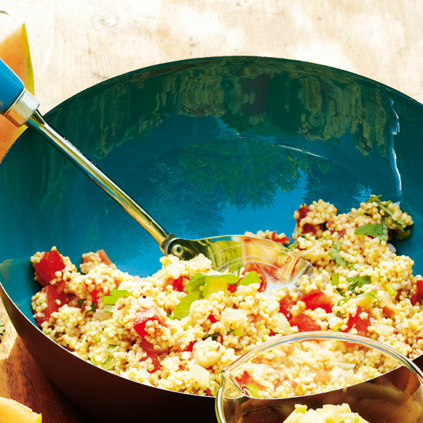 Inzwischen Tomaten waschen und vierteln, dabei die Stielansätze entfernen, die Kerne herauslösen und das Fruchtfleisch klein würfeln. Den Koriander abbrausen und trocken schütteln, die Blättchen abzupfen, fein hacken und mit dem Limettensaft und den Tomaten unter die Hirse mischen. Sofort servieren.