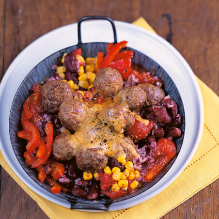 Bohnen, Mais, Paprika, restliche Zwiebeln und die Tomaten in eine gefettete Auflaufform geben. Mit Salz, Pfeffer, Cayennepfeffer und Koriander würzen. Hackbällchen darauf verteilen, Cheddar darüber streuen. Im Ofen (Mitte, Umluft 180°) ca. 25 Min. backen.