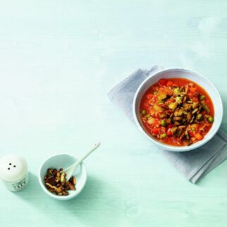Das Rapsöl in einem Topf erhitzen und Zwiebel und Knoblauch darin bei mittlerer Hitze in 4 Min. glasig braten. Die Zucchinischeiben dazugeben und ca. 5 Min. braten. Die Tomaten sowie die Gemüsebrühe dazugeben und erhitzen.