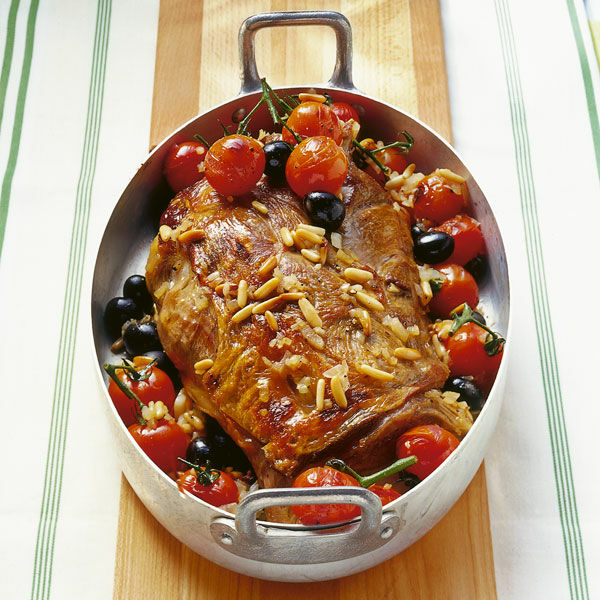 Die Kirschtomaten waschen, die Stielansätze mit einem scharfen Messer entfernen. Tomaten mit den Oliven in den Bräter geben, etwa 15 Min. mitschmoren lassen. Das Fleisch vor dem Tranchieren 10 Min. zugedeckt ruhen lassen. Quer zur Faser in Scheiben vom Knochen schneiden und auf angewärmten Tellern mit der Tomaten-Olivensauce servieren. Dazu schmecken Rosmarinkartoffeln oder knuspriges Weißbrot.