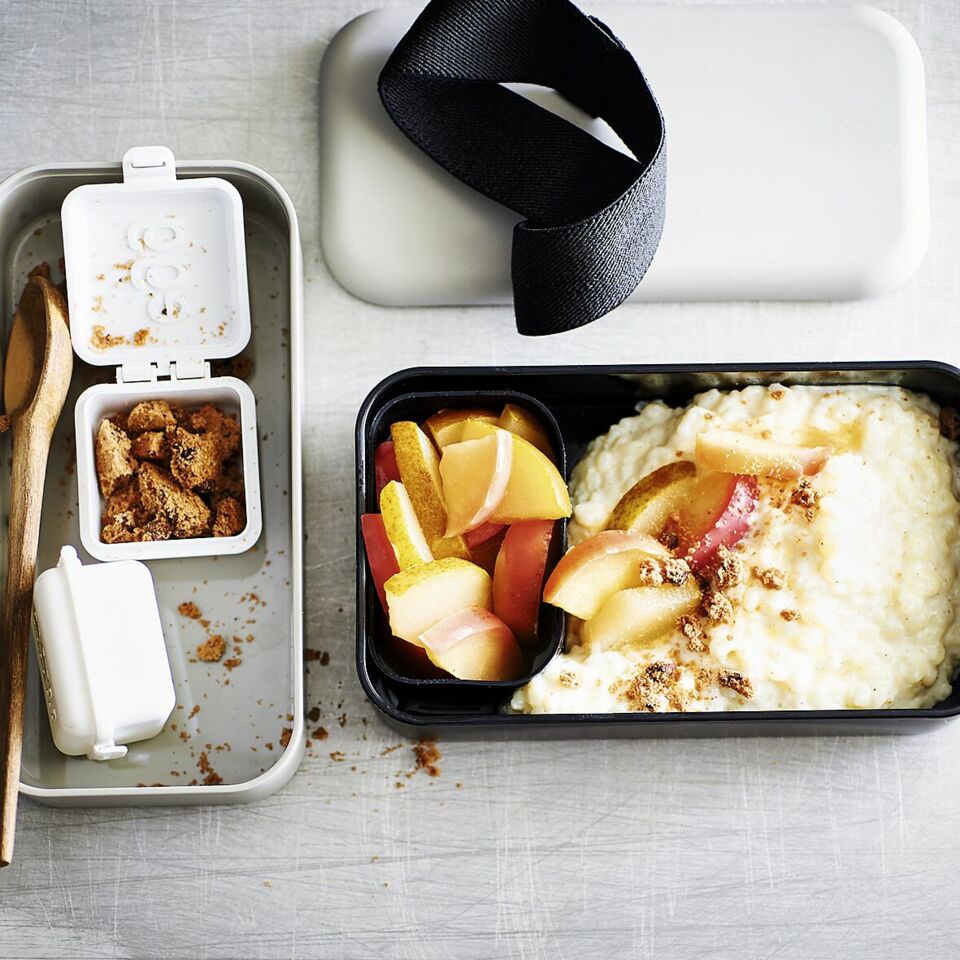 Den Milchreis vom Herd nehmen und nach Belieben süßen. Zum Mitnehmen in Boxen packen, mit Apfel-Birnen-Mix toppen und die Kekse darüberbröseln.