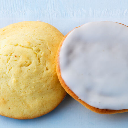 Für den Guss die Zitrone auspressen und den Saft mit dem Puderzucker glatt rühren. Die flache Seite der Amerikaner mit der Glasur überziehen.