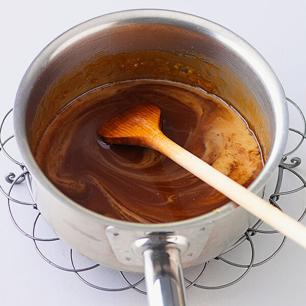 Für die Füllung in einem Topf den Zucker mit 2 EL kaltem Wasser schmelzen, bei stärkerer Hitze ohne Rühren zu einem hellen Karamell kochen. Vom Herd nehmen. Butter, Salz und 50 g Sahne unterrühren. Es soll eine weiche Karamellcreme entstehen. Beiseitestellen. Den Backofen auf 180° (Umluft 160°) vorheizen.