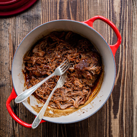 Die BBQ-Sauce in den Topf geben und mit dem Fleisch vermengen. Alles noch ein paar Minuten lang miteinander erwärmen.