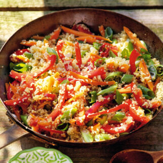 Couscous nach Packungsangabe mit heißer Gemüsebrühe überbrühen und quellen lassen. Falls nötig, noch 1-2 EL kochendes Wasser unterrühren. Inzwischen übrige Paprika und Tomaten putzen und in sehr feine Würfel schneiden. Frühlingszwiebel putzen, waschen und fein schneiden. Couscous mit den Gemüsewürfeln und 1 EL Olivenöl vermischen und kräftig mit Salz und Pfeffer würzen. Mischung mit einem Teelöffel in die Paprikaschoten füllen. Die Deckel aufsetzen.