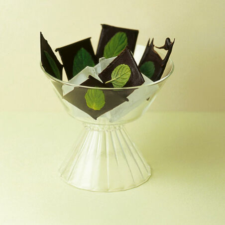 Auf jedes Quadrat ein Minzeblättchen drücken. Das Blech etwa 30 Min. in den Kühlschrank stellen. Die gekühlten Schokoblättchen von der Alufolie abziehen. Auf eine kleine Platte geben. Auf eine mit Eiswürfeln gefüllte Schüssel stellen und servieren.