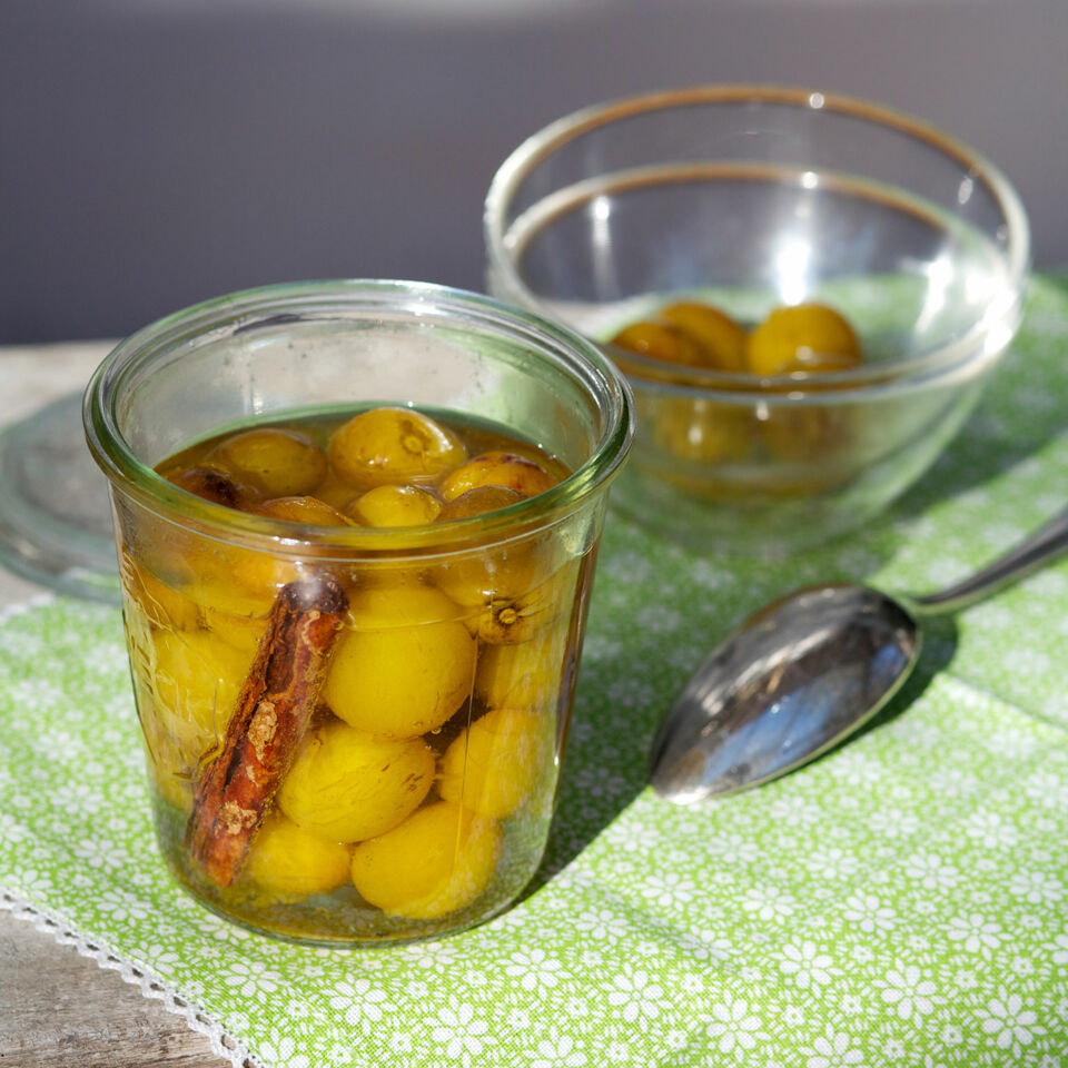 Die Mirabellen mit dem Sud und dem Gewürz bis 2 cm unter den Rand in die sorgfältig gereinigten Gläser füllen und sofort verschließen. Zum Haltbarmachen 30 Min. bei 90° im Backofen oder im Topf einkochen.