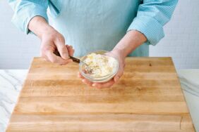 In einer kleinen Schüssel die Panko-Brösel mit dem restlichen Parmesan und 1 EL Olivenöl verrmischen. Anschließend 1 EL der Bröselmischung unter die Mangoldmasse ziehen. Die Füllung mit ¼ TL Pfeffer abschmecken.