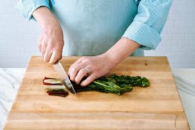 Die Stielenden von den Mangoldblättern abschneiden und wegwerfen. Die Blätter einmal längs falten und dann zusammendrehen, um überschüssige Feuchtigkeit auszuwringen. Die Mangoldblätter mit einem Kochmesser grob hacken.