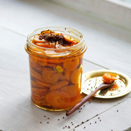 Die Möhren 2-3 Wochen an einem dunklen, kühlen Ort aufbewahren und durchziehen lassen, dabei die Gläser täglich einmal kurz aufschütteln, damit sich die Aromen gut entfalten können.