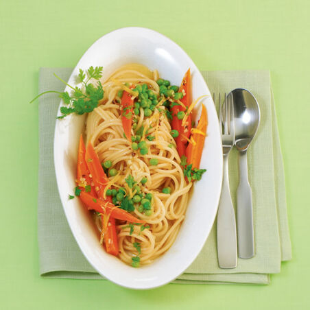 Die beiden süß-aromatischen Frühlingsklassiker Erbsen und Möhren gehen hier mit den langen, dünnen Italo-Klassikern Hand in Hand.