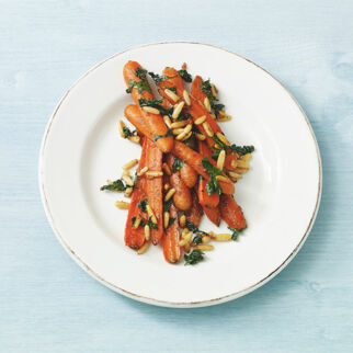 Anrichten: Rucolablätter auf vier große Teller verteilen. Den Möhren-Orangen-Salat darauf anrichten und mit Pinienkernen bestreuen.