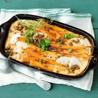 Möhren-Quark-Mischung in zwei kleine, gefettete Auflaufformen (je ca. 15 cm Ø) geben und im heißen Ofen (Mitte) ca. 15 Min. backen.