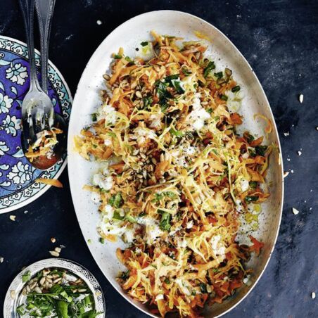 Die Möhren putzen, schälen, auf einer Rohkostreibe raspeln und in eine Salatschüssel geben. Den Spitzkohl waschen, halbieren, den Strunk keilförmig herausschneiden und den Kohl in hauchfeine Streifen schneiden.