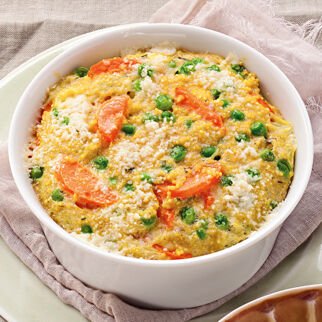 Den Backofen auf 180° (Umluft 160°) vorheizen. Die Möhren schälen und in feine Scheiben schneiden oder hobeln. Die Petersilie waschen und trocken schütteln. Die Blättchen abzupfen und fein hacken. Erbsen, Möhren und Petersilie mischen, mit Salz und Pfeffer würzen.