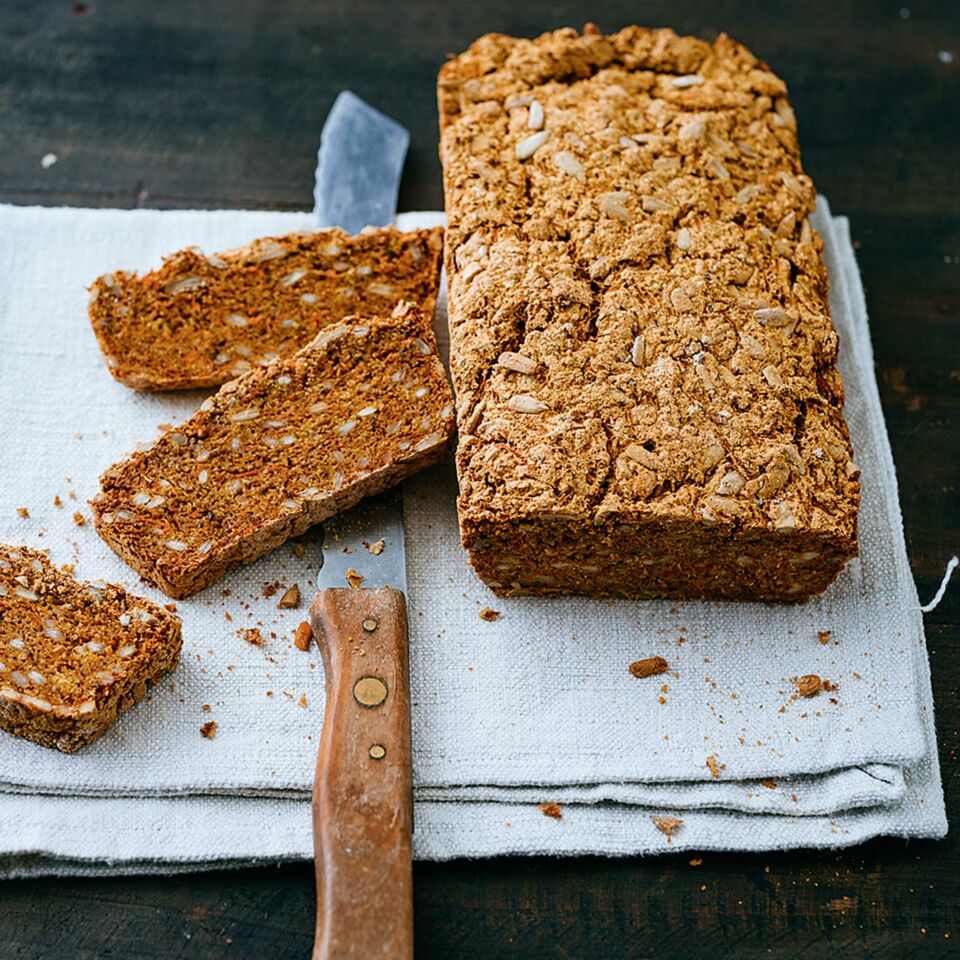 Ofen auf 175° vorheizen, Form gut fetten. Möhren putzen, schälen und fein raspeln. Alle Zutaten in einer Schüssel mit der Hand zu einem homogenen Teig kneten und in die Form füllen. Das Brot im heißen Ofen (Mitte) 1 Std. 15 Min. backen, herausnehmen und auf einem Kuchengitter auskühlen lassen.