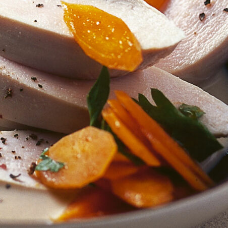 Petersilie waschen, Blättchen grob zerschneiden, mit den Möhren mischen.