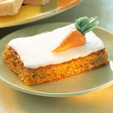 Den Puderzucker mit der Milch glatt rühren. Den abgekühlten Kuchen damit glasieren und mit den Marzipanmöhrchen verzieren.