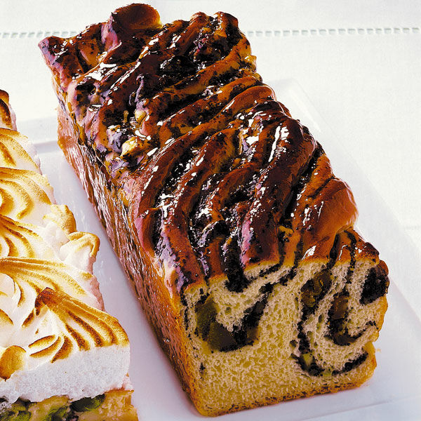 Form mit Backpapier auslegen. Teig zu einem Rechteck (30 × 40 cm) ausrollen. Füllung darauf streichen. Aufrollen, einmal längs durchschneiden. Beide Teigstränge umeinander wickeln. In der Form 20 Min. gehen lassen.