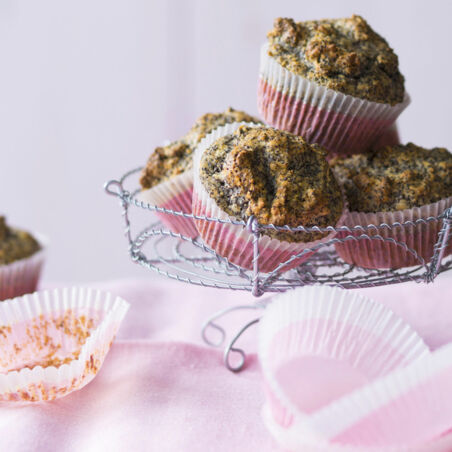 Ofen auf 180° (Umluft) vorheizen, die Papierförmchen auf ein Blech setzen. Für die Mohnmasse den Mohn in einer Schüssel mit der heißen Milch überbrühen und mit Vanille, 0,6 g Steviosid-Extrakt und 1 Prise Salz mischen. Anschließend die Mohnmischung ca. 15 Min. quellen lassen.