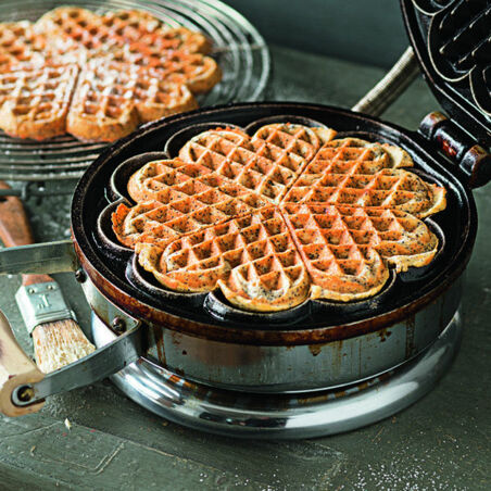 Das Waffeleisen vorheizen, die Backflächen dünn einfetten. 2 gut gehäufte EL Teig mittig auf die untere Backfläche geben und das Waffeleisen schließen. Die Waffel in ca. 2 Min. knusprig-hellbraun backen. Die Waffel herausnehmen, auf ein Kuchengitter legen und mit dem übrigen Teig genauso verfahren.