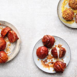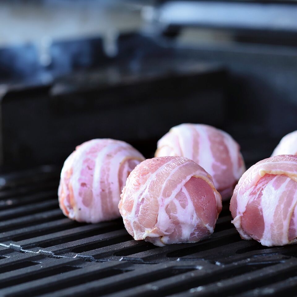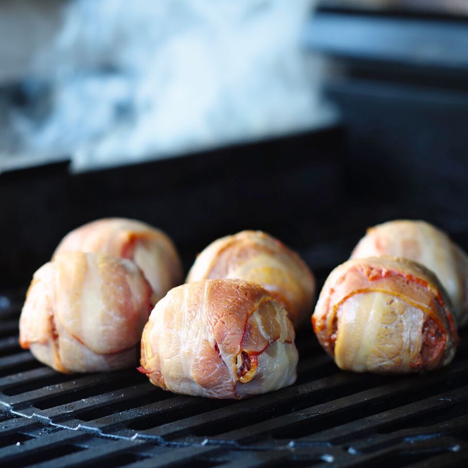 TIPP: Die Moink Balls könnt ihr auch als BBQ-Fingerfood zubereiten. Dann formt ihr aus der Hackfleischmasse 26–28 Bällchen (je 30–40 g), umwickelt die Bällchen mit jeweils nur 1 Scheibe Speck und fixiert den Speck mit einem gewässerten Zahnstocher.
