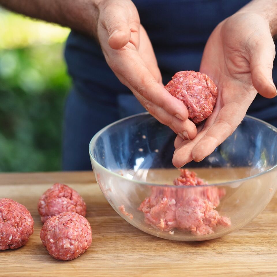 Die Hände leicht mit Öl oder Wasser einreiben und das Hackfleisch zu 3–4 cm großen Hackbällchen formen (insgesamt 16 Stück).