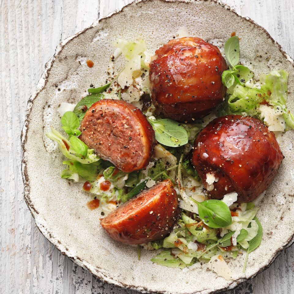 Die Moink Balls weitere 10 Min. grillen und dabei immer wieder mit 150 ml BBQ-Sauce einpinseln, bis sie aufgebraucht ist. Zum Servieren die Moink Balls nach Belieben auf einem Salat anrichten und die restliche BBQ- Sauce dazu reichen.