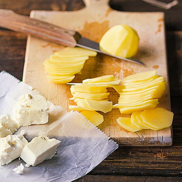 Die Kartoffeln schälen, waschen und in dünne Scheiben schneiden. Schafskäse zerkrümeln. Den Backofen auf 180° vorheizen. Eine große rechteckige ofenfeste Form fetten. Unter die Sauce den Pecorino und die Eier rühren, salzen und pfeffern.