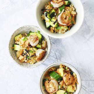 Mozzarella mit Kaviar bestreichen und mit Salat, Gurke, Avocado und je 3 Garnelen belegen. Mit Hilfe der Folie von unten her fest zusammenrollen. Dabei soll der freigelassene Rand auf ein Stück Nori-Blatt treffen, so dass die Rollen gut halten. Jede Rolle achteln, mit der gewürzten Sojasauce zum Dippen servieren.