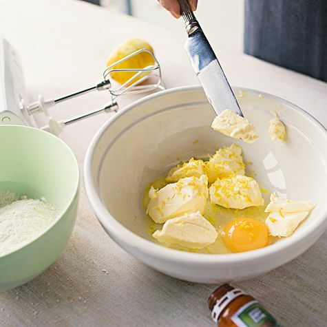 Butter, Steviosid-Extrakt, Ei und Zitronenschale zuerst mit den Quirlen des Handrührgeräts schaumig rühren, sodass sich der Steviosid-Extrakt gut verteilt.