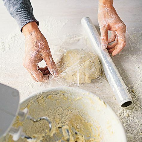 Den Teig auf der bemehlten Arbeitsfläche mit den Händen zu einer Kugel formen, in Frischhaltefolie einwickeln und mind. 10 Min. kühl stellen.