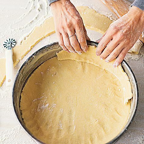 Teig auf wenig Mehl ca. ½ cm dick ausrollen, einen Boden ausschneiden und in die Form legen. Aus den Teigresten einen Rand formen und andrücken.