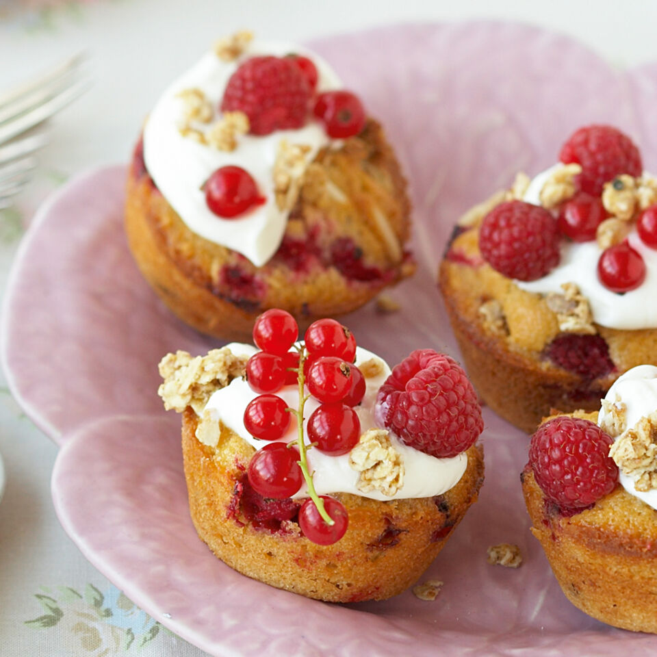 Für das Topping den Joghurt verrühren und auf die Cupcakes geben. Die Cakes mit den übrigen Beeren garnieren und mit Knuspermüsli bestreuen.